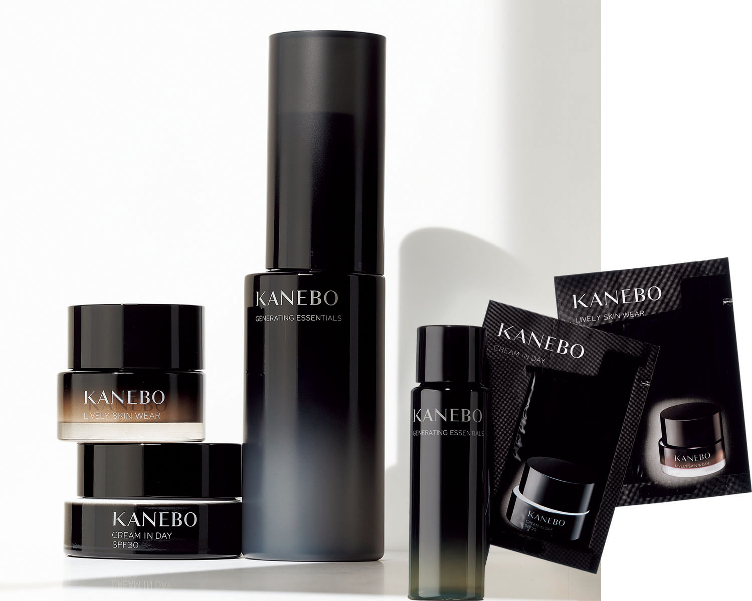 重ねる年月を成長に変える、新化粧水と新時代の名品セット。左から: ジェネレイティング エッセンシャルズ<美容化粧水>30ml、クリーム イン デイ II<朝用クリーム・化粧下地>[医薬部外品]肌あれ・あれ性 SPF30・PA+++ パウチ1包、ライブリースキン ウェアII 230 Vanilla<ファンデーション・美容液>SPF4・PA+ パウチ1包