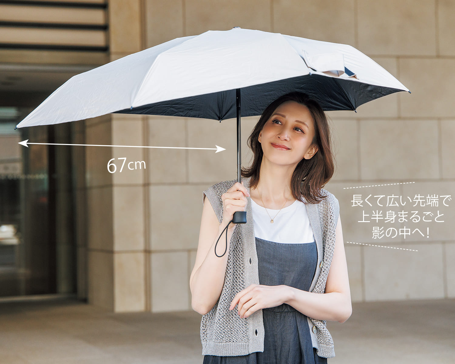 親骨67㎝の長く広い先端が特徴。太陽の向きに合わせて傾けるだけで影が広がり、腕までしっかりカバー。上半身をすっぽり覆い、体感温度もぐっと軽減。遮光・遮熱効果も最大限に発揮します。