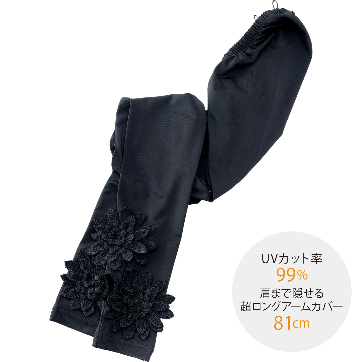 立体的なフラワーモチーフが目を引くエレガントなデザイン。手の甲をしっかり覆いながら、指先は動かしやすく実用性もあり。コーディネートのアクセントにもなる〝見せるUV対策〟です。