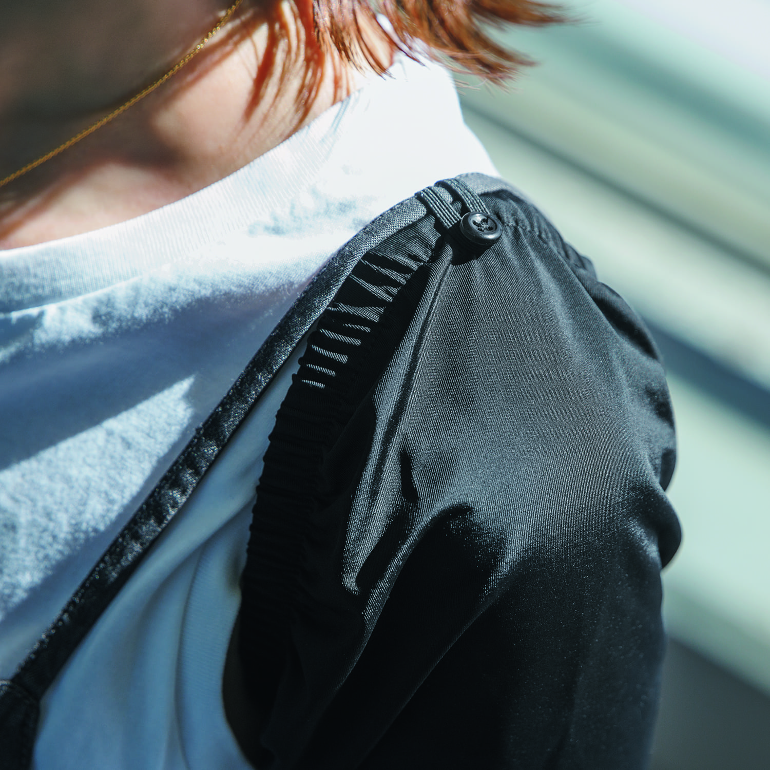 インナーの紐に通してボタンで固定。万が一外れても、滑り止め付きでずれ落ちをしっかり防ぎます。