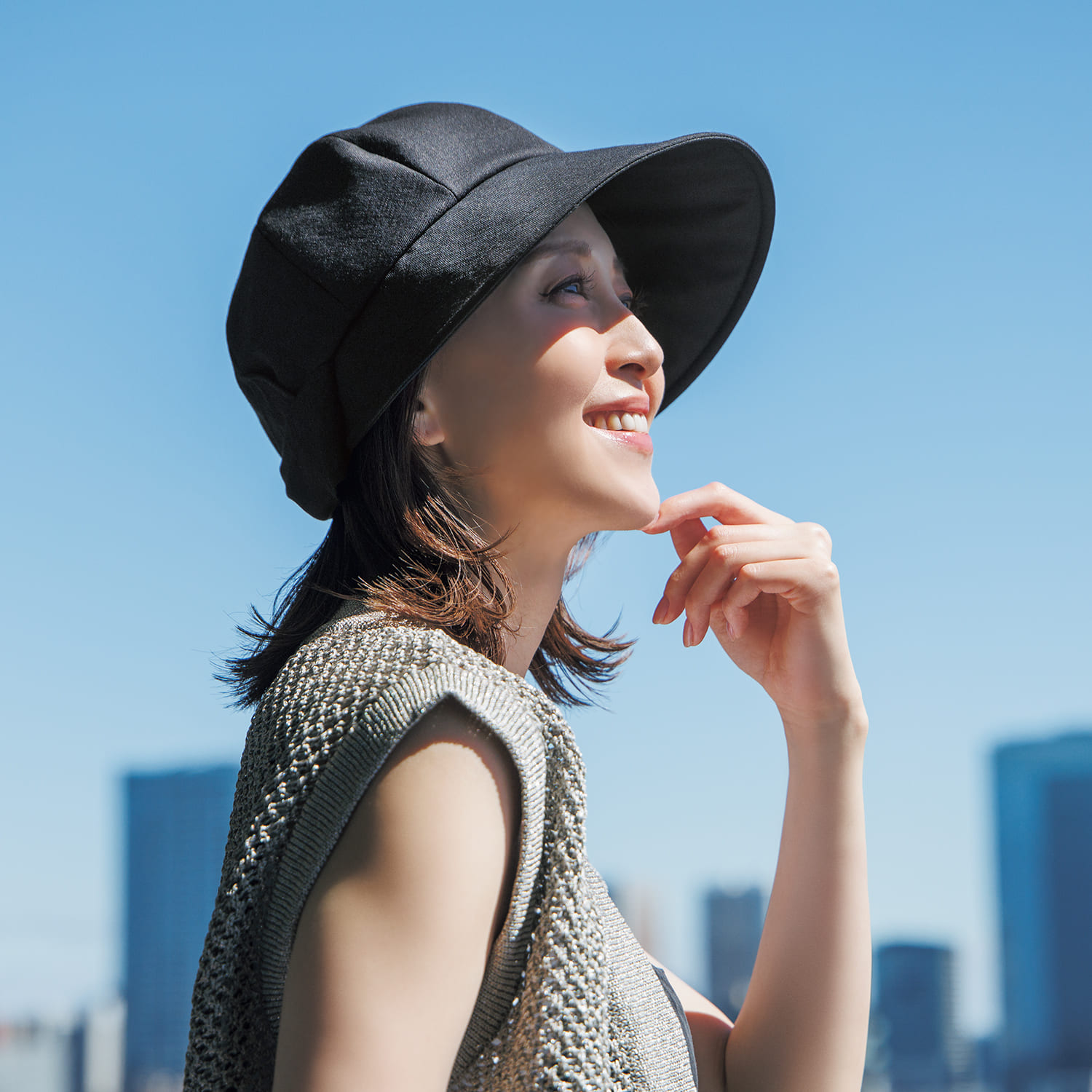 つば幅10㎝の広め設計で、額から頰まで紫外線をしっかりブロック。深めにかぶれる立体フォルムが顔まわりに自然に影をつくり、小顔見え効果も。きれいめなデザインだから、街でもゴルフでも活躍する一品です。