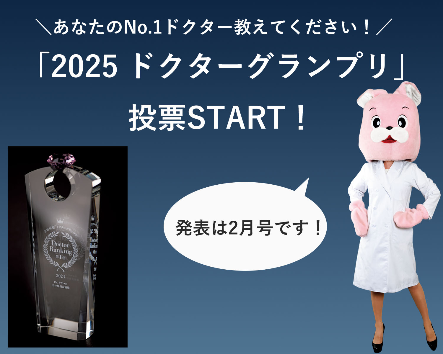 本年も、美ST2月号(12月17日発売予定)にて、「2025ドクター グランプリ」を発表します。ドクターたちは日々、読者の方々の厳しい声に耳を傾けながら診療にあたっています。2025年のあなたのナンバーワンドクターを選んでください。
