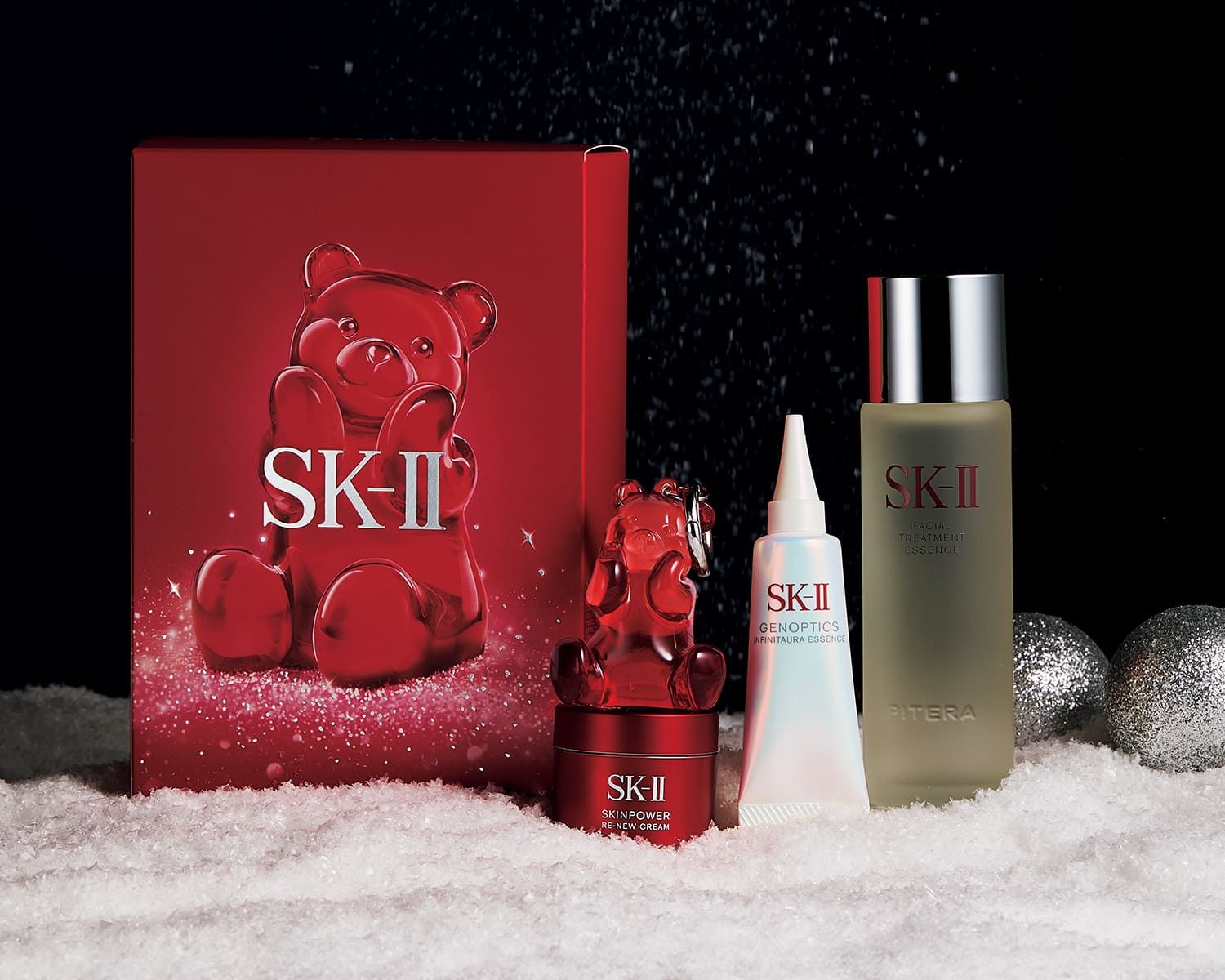 名品化粧水「フェイシャル トリートメント エッセンス」現品に、美白美容液と新作「スキンパワー リニュー クリーム」のミニサイズをセット。ライン使いで透明感のある素肌に導いてくれる信頼のコフレ。今年はSK-II初のオリジナルキャラクター「ぴてくま」のチャーム付き!キュートな赤いベアと一緒にホリデーのスキンケアを楽しんで。SK-II ピテラ™️ ベストコレクション 2025 ホリデーコレクション ¥13,970〈編集部調べ〉(SK-II)