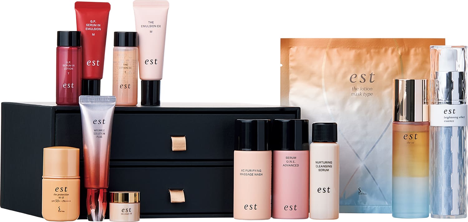 現品4つと特別サイズのスキンケアが9つの計13アイテム入り。エスト ホリデーコレクション 2025 ¥28,600(エスト)