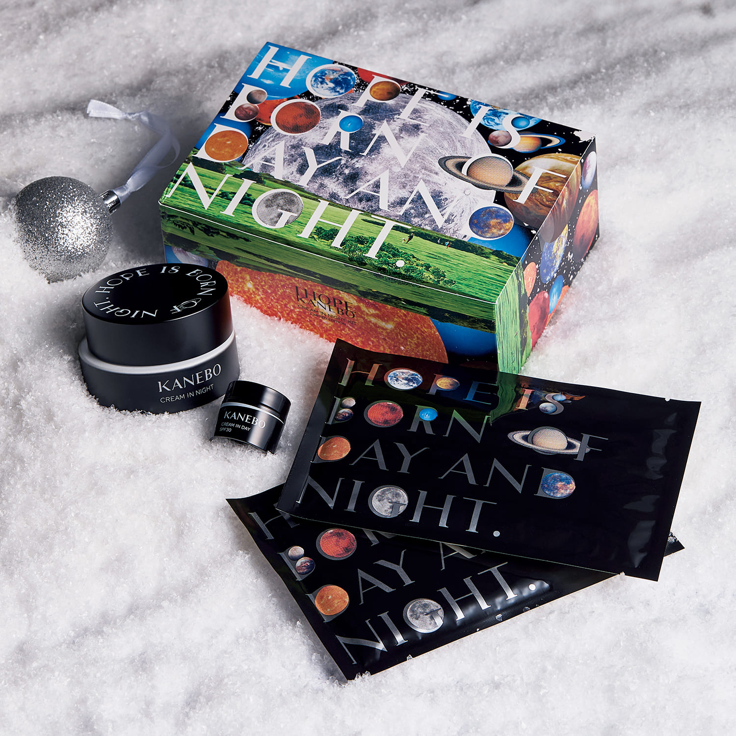 乾燥から肌を守る「胎脂」の力に着想を得た人気の夜クリーム現品に、肌を引き上げながらピタッと密着するシートマスク2枚とメークのりを高めるデイクリームのミニサイズがイン。セット使いでもっちりハリ肌に! グラフィックアーティスト伊藤桂司氏とコラボしたボックスにも注目。カネボウ クリーム イン ナイトⅡ キット リミテッド エディション ¥13,750(カネボウインターナショナルDiv.)