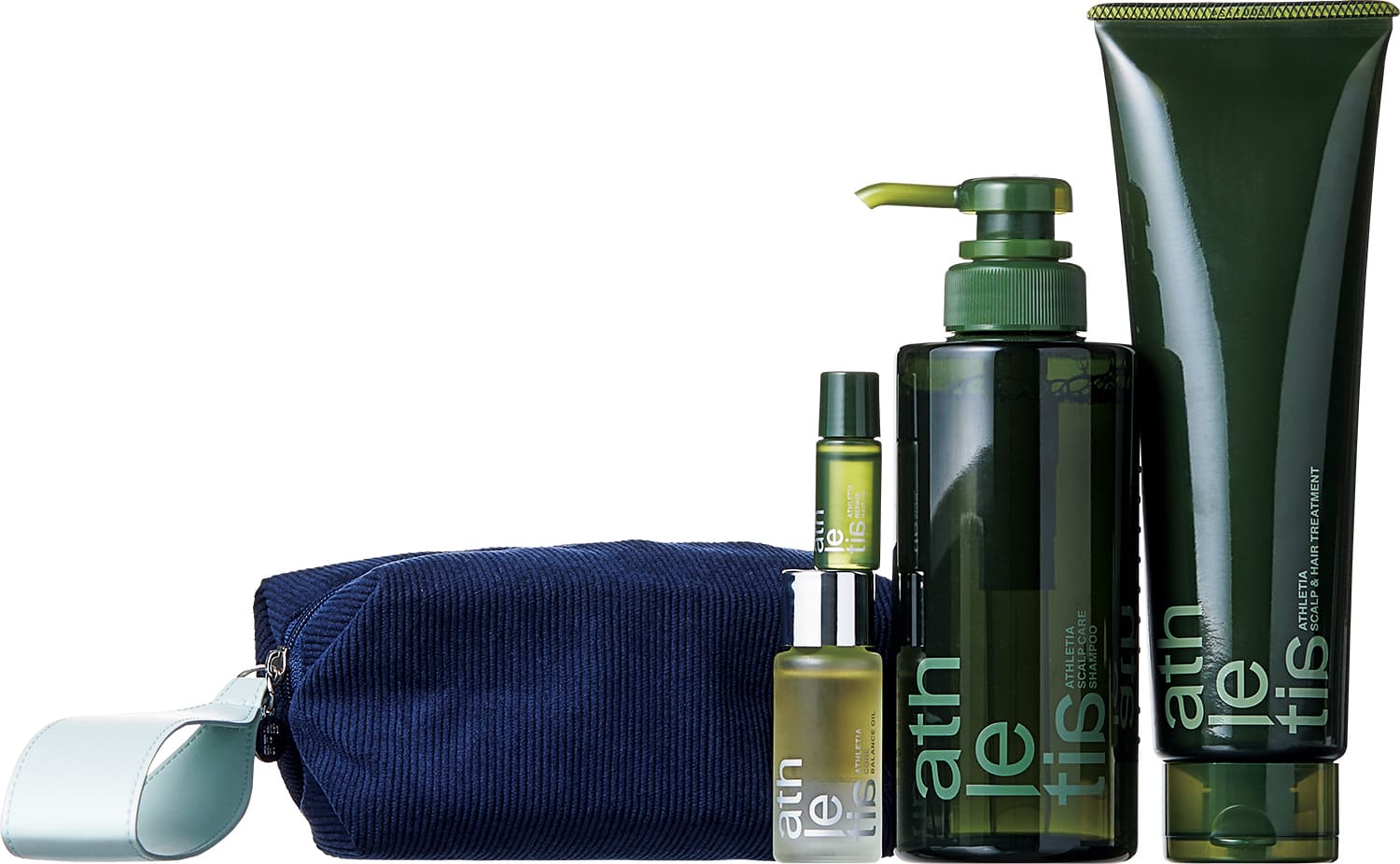 人気のシャンプー&トリートメントの現品に、ヘアオイルとブースターオイルのミニサイズ、ポーチがセット。豊かなアロマの香りに癒されて。athletia ヘアケア ホリデーキット ¥9,350※11月7日発売(athletia)