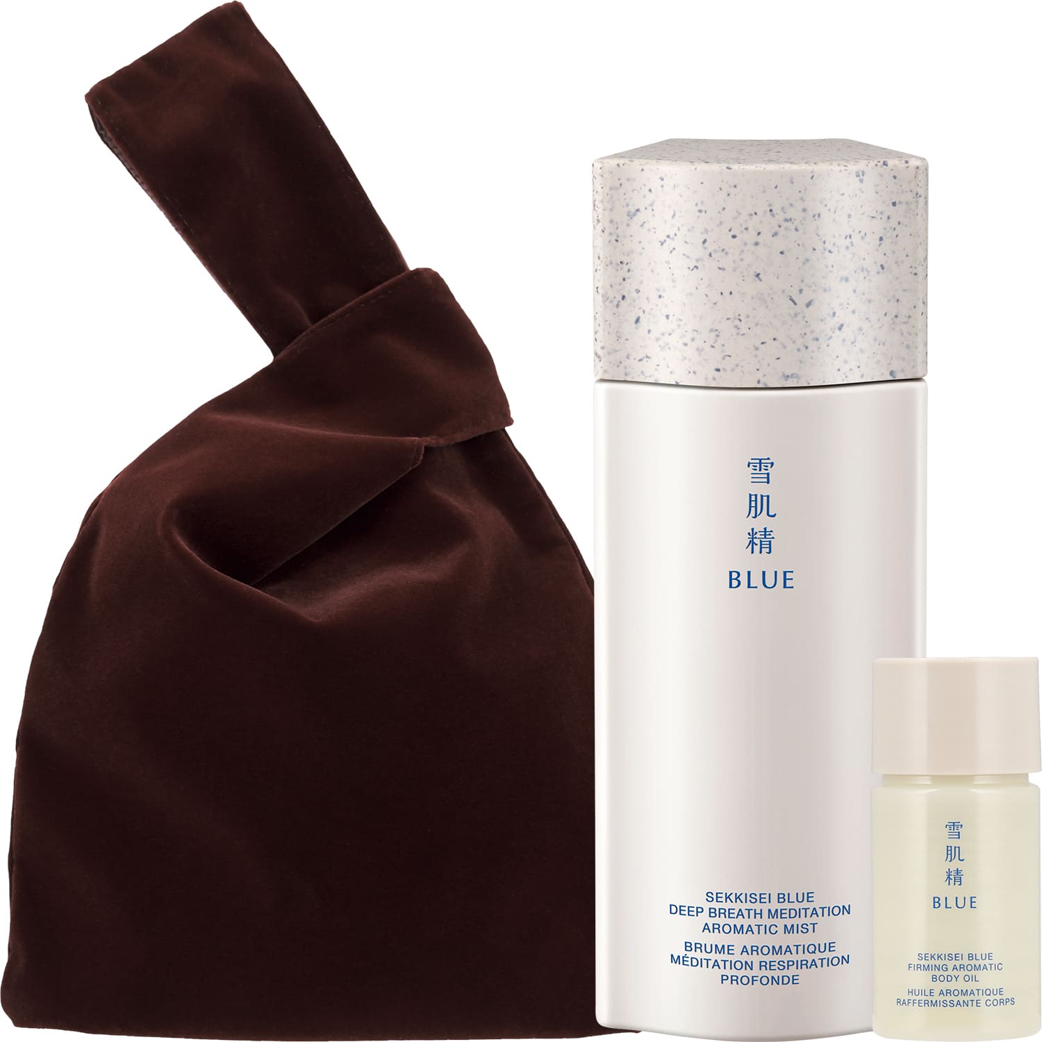 「雪肌精 BLUE ディープブレス メディテーション アロマ ミスト」の現品に「同 ファーミング アロマ ボディ オイル」のミニサイズとオリジナルバッグがセットされたキット。ミストはどんなシーンでも心地よく使える、スパイシーハーバルウッディの香り。和漢植物を配合したオイルはふっくらハリ肌に。雪肌精 BLUE ディープブレス メディテーション アロマ ミスト リミテッドキット ¥5,500〈編集部調べ〉(コーセー)