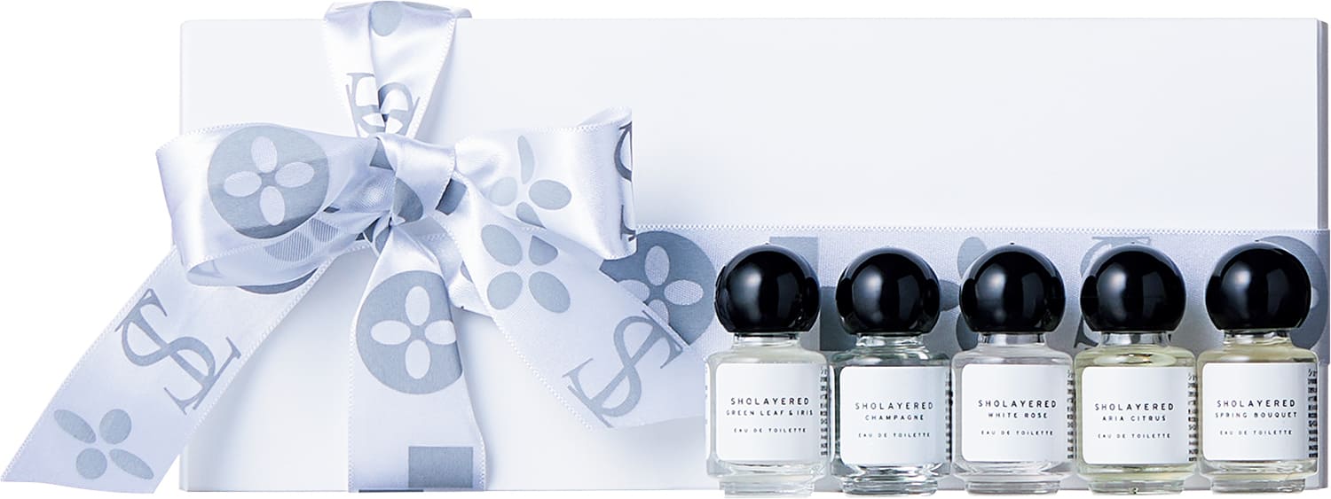 旅行やお出かけに便利なミニサイズのオードトワレ5種セット。人気の香りを楽しんで。ショーレイヤード オードトワレ コフレセット ¥5,500(セントネーションズ)