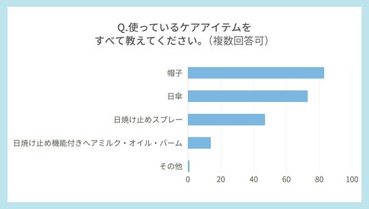 一方、「日焼け止めアイテムを使っている」と答えた方たちが使っているアイテムは、「帽子」が83票、「日傘」が73票、「日焼け止めスプレー」が47票、「日焼け止め機能付きヘアミルク・ヘアオイル・バーム」が14票という結果に。髪の日焼け対策は、帽子や日傘でおこなう方が多いようです。