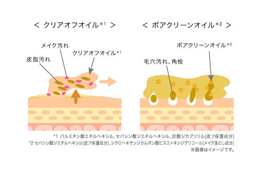 “肌表面の汚れ”を浮かせて落とす「クリアオフオイル*18」と、“毛穴にたまった汚れ”を溶かして落とす「ポアクリーンオイル*19」のダブル配合。毛穴汚れや古い角質、角栓をすっきりオフして、つるんとした毛穴レス*8肌へ導きます。