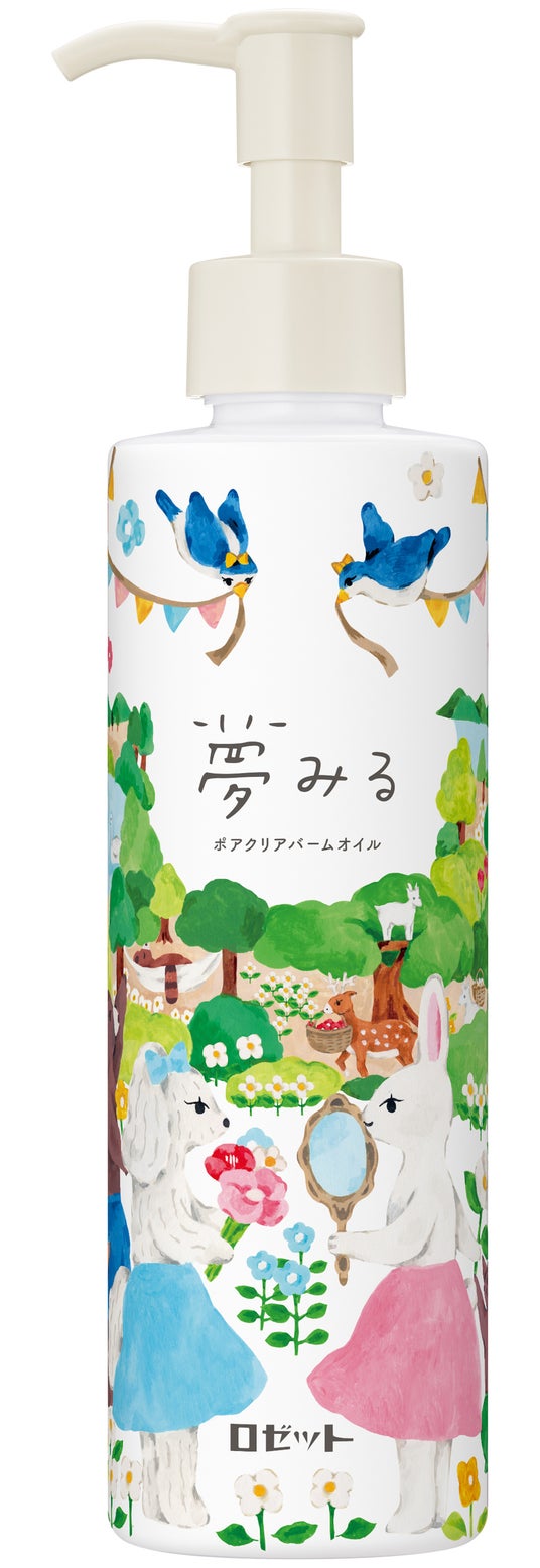 『夢みる』はイラストレーター・やがわまき さん描き下ろしのかわいいパッケージデザインも人気です。「ポアクリアバームオイル」には自然の山々、湖、お花畑が広がる“夢みる自然”が描かれています。