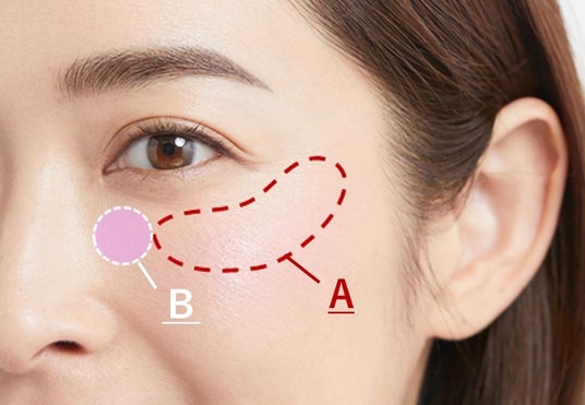 A.淡い発色のチークを、黒目の下からこめかみに向かって、ぼかし