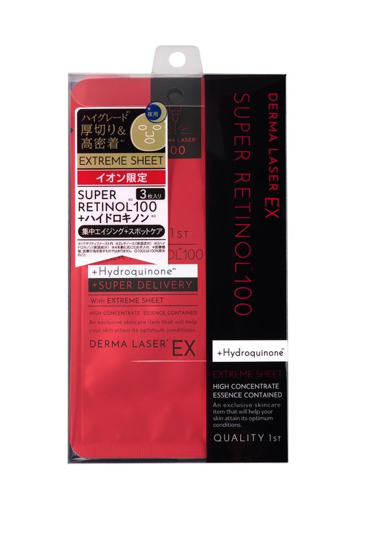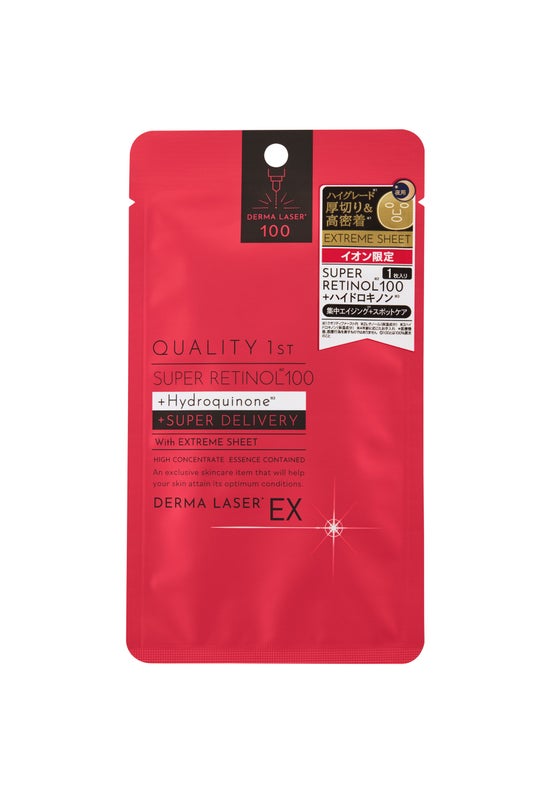 株式会社クオリティファースト(本社: 東京都港区、代表取締役:渡邉 治樹) は、ダーマレーザーマスクの進化版「ダーマレーザーEX」からシリーズ最高峰*1 のエイジングケアマスク「ダーマレーザーEX スーパーレチノール+ハイドロキノン マスク」(容量:1枚35mL×3袋/価格:770円<税込>)をイオン限定で発売いたします。