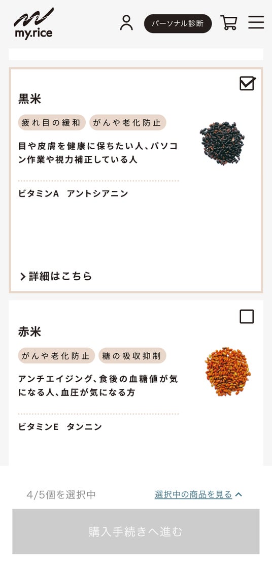 公式サイトにて、診断を受けるかご自身で雑穀を選択して、自分だけのオリジナル雑穀米を作れます。
