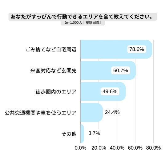 すっぴんで行動できるエリアについては、1位「ごみ捨てなど自宅周辺」78.6%、2位「来客対応など玄関先」60.7%、3位「徒歩圏内のエリア」49.6%、4位「公共機関や車を使うエリア」24.4%という結果でした。