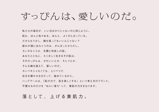 ハップアールは2018年のスタート以来、「肌の力で、肌を美しくする」という考え方のもと、不要なものだけを“ねらい落ち”する洗顔料やクレンジングを展開しています。ハップアールが考える「すっぴん」はノーメイクという意味だけではなく、ありのままのナチュラルな姿を意味しています。