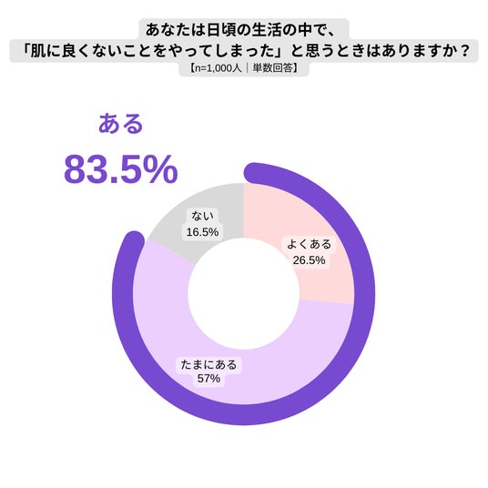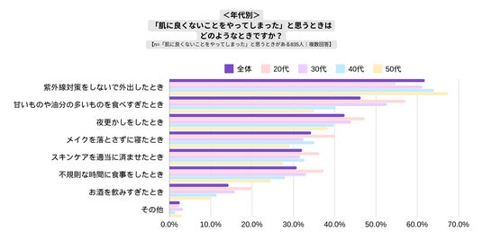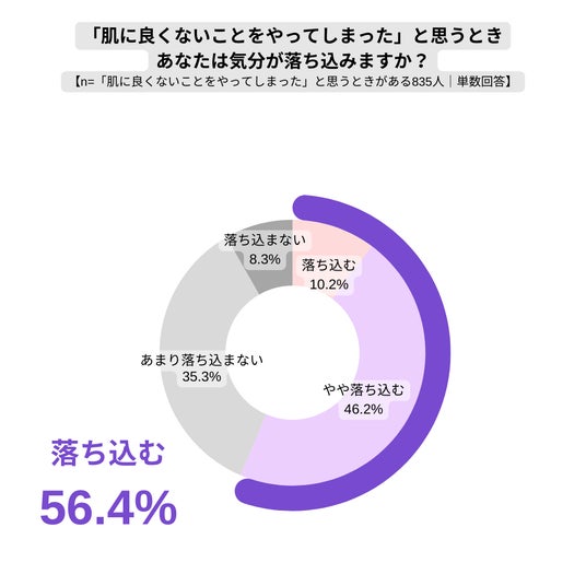 「“肌に良くないことをやってしまった”と思うときはありますか?」という質問には、83.5%が「ある」と回答。「紫外線対策をしないで外出したとき」「甘いものや油分の多いものを食べすぎたとき」「夜更かしをしたとき」に“やってしまった…”と感じる人が多いことがわかりました。年代別にみると、20代は「甘いものや油分の多いものを食べすぎたとき」が最も多く、30代・40代・50代は「紫外線対策をしないで外出したとき」が最も多いという結果になりました。肌によくないことをやってしまうと落ち込んでしまうと回答したのは、56.4%。年齢が若いほど落ち込む傾向にあるようです。