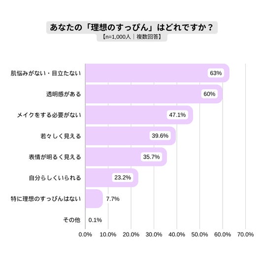また、「理想のすっぴん」については、1位「肌悩みがない・目立たない」63%、2位「透明感がある」60%で、「自分らしくいられる」は23.2%でした。