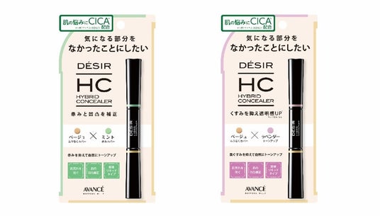1997年に日本で初めてまつげ美容液を展開したパイオニアであるアヴァンセ株式会社(本社:東京都港区 代表:難波亮)の新ブランドDESIR(デジール)よりハイブリッドコンシーラーが誕生します。今回リキッドタイプのコンシーラーでベージュ×カラーという2色展開のスティックコスメは、市場ではなかなか見られない貴重なアイテムとなりました。昨年DESIR(デジール)ブランド誕生と共にデビューしたBPクリームに合わせて、『気になる部分をなかったことにしたい』をキーワードに‘赤みを抑えニキビ跡の凹凸などを補整’のベージュ×ミント、‘くすみを抑え透明感をアップ’のベージュ×ラベンダー、の2種類のコンシーラーが2024年9月6日(金)より全国で発売となります。