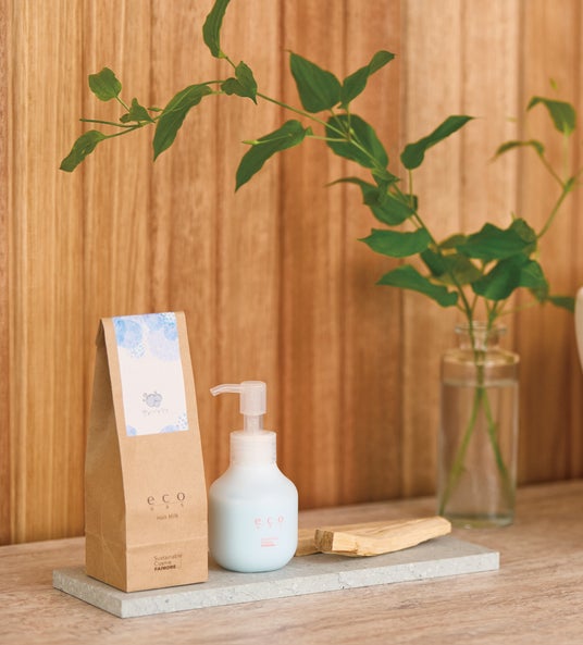 ボトル容器に一部再生材を使用し、ヘアオイルとヘアミルクの化粧袋にはナチュラルな雰囲気と柔らかな紙の風合いを採用し、化学薬品の使用を抑え環境に配慮したサスティナブルデザイン。
