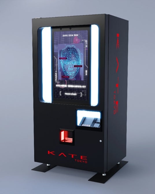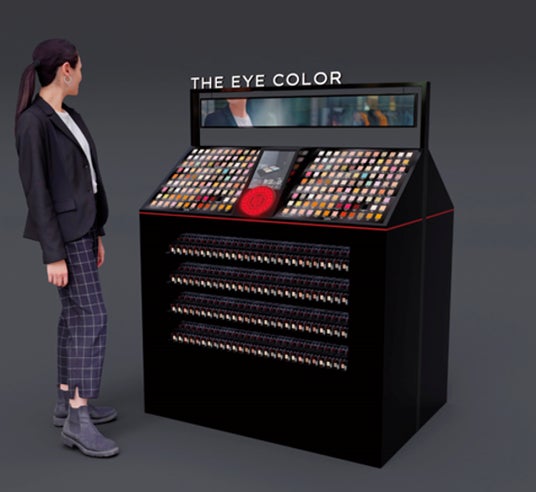 AI技術とKATE独自ロジックの顔印象分析によりパーソナライズされた4色のアイカラーが自動販売機のように出てくるデジタルコンテンツ「KATE iCON BOX」を試せるのは、この店舗だけ!26色のアイカラーから、お客様一人ひとりにあった4色をレコメンドいたします。