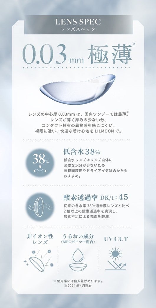 LILMOON(リルムーン)「0.03シリーズ」は、全度数レンズの中心厚が0.03mmで、国内ワンデーでは最薄※3です。レンズが薄く厚みが少ない分、まるで裸眼のような快適な付け心地でコンタクト特有の異物感を感じにくいです。