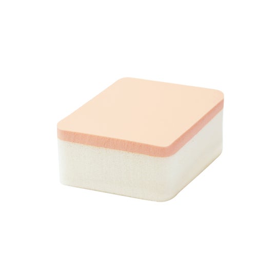 ベースメイクにも、ポイントカラーメイクにも使える、異なる硬さの二種類のスポンジが一つになった機能的なメイクアップ用スポンジ。
