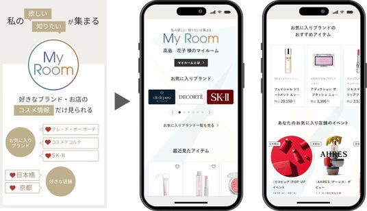 「タイパ良く、楽しくお買いものしたい」という声にお応えするため、今回新たに「マイルーム」機能を導入いたします。事前にお気に入りのブランドや店舗を登録することで、関連した情報が表示されます。また、ひとつのページで自分好みの情報を収集することができ、より効率的にお買物をお楽しみいただけます。