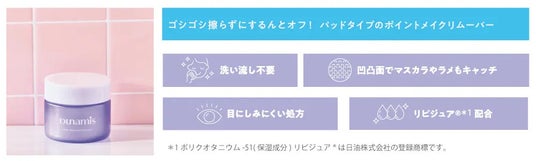目にしみにくく、うるおいリッチながら、凹凸パッドでやさしくふきとれるため、濃いアイメイクもするんと落とせる。洗い流し不要が嬉しいポイント!