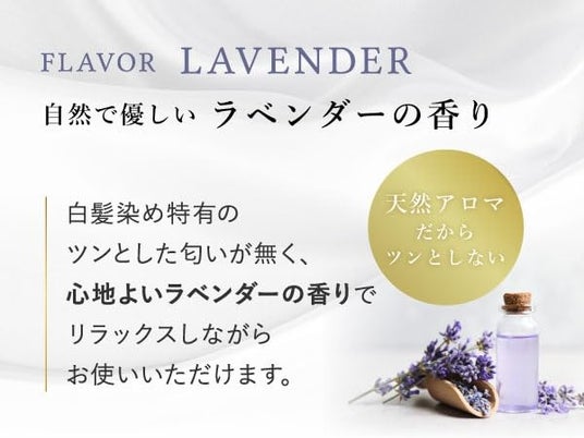 白髪染め特有のツンとした匂いが無く、心地良いラベンダーの香りでリラックスしながらお使いいただけます。