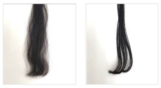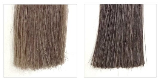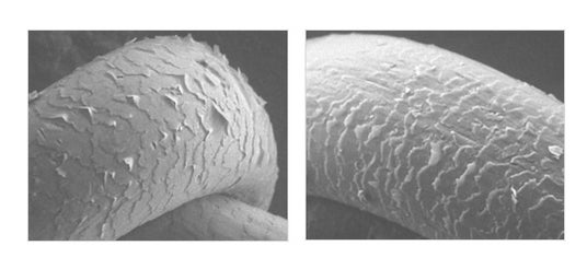 髪のうるおいを逃しません。ヘアオイルを塗布した方は(右)キューティクルのめくれが少ないことがわかります。