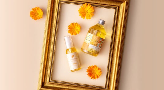 【右】アロマバスエッセンス キンモクセイとカレンデュラ 300mL 2,640円(税込)/ 約18回分、【左】カレンデュラのいたわりヘアオイル 金木犀の香り 81mL 2,475円(税込)