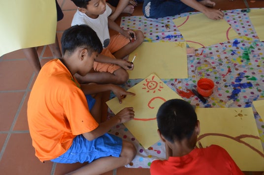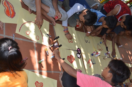 病気・戦争・災害などで心に傷を負った世界中の子どもたちへ 画材を提供し、心のケアを目的としたアートワークショップを国内外で行っています。子供たちの絵をデザインに活用した商品の収益金を、世界中の子供たちに還元しています。