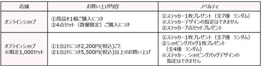 期間中、対象ショップにて該当商品をお買い上げの方に、お買い上げ金額に応じてノベルティをプレゼントします。