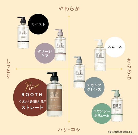 そのような中BOTANISTは、サロンレベルのケアが叶うブランドとして40代以降の幅広い層にも支持されている点や、ドラッグストアで手軽に購入できる点を強みとし、年齢を重ねるにつれて感じる、ツヤ不足、パサつき、うねりなど髪質の変化にお悩みの方に向けたエイジングケア*4ライン「ROOTH(ルース)」シリーズを2022年に発売し、好評をいただいております。