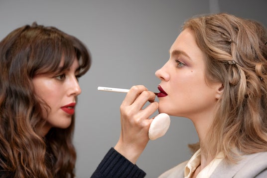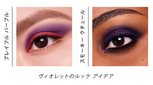 ヴィオレットはコレクションのアイテムから〈オンブル ジェ 045 マルモ バイブ〉のパープルとオレンジレッドのシェードで印象的なグラフィック アイを、アイコニックな〈ルージュ ジェ ラグジュリアス ヴェルヴェット 510〉とサテン フィニッシュの限定色〈ルージュ ジェ 45〉を絶妙にブレンドした、サテンのようなプラムレッドの唇を演出し、メイクアップを完成させました。