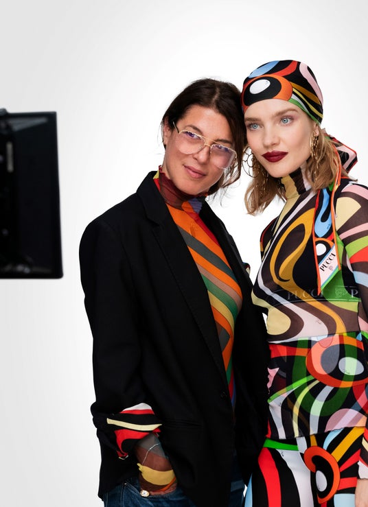 カミーユが提案したスタイリングは、マルモパターンをあらゆる形で表現しています。ナタリアが着用したのは、シルクのスカーフと、プッチを象徴するハウスロゴをあしらったオーバーサイズのイヤリング。