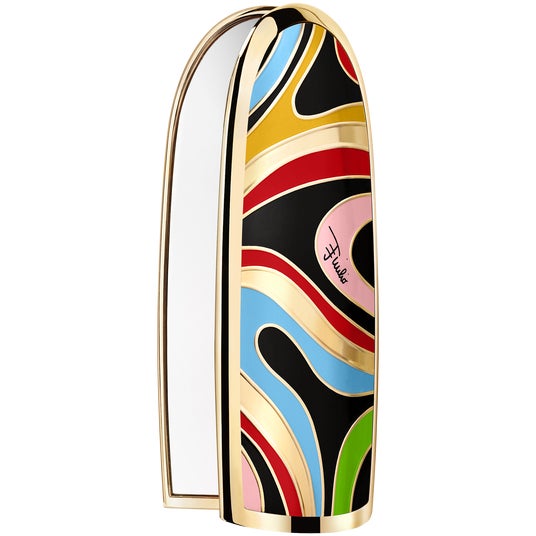 進化した新しい〈ルージュジェ〉のアイコニックなゴールドのケースは、プッチのマルモプリントで包まれました。ゴールド ストライプとエナメル カラーが施されています。