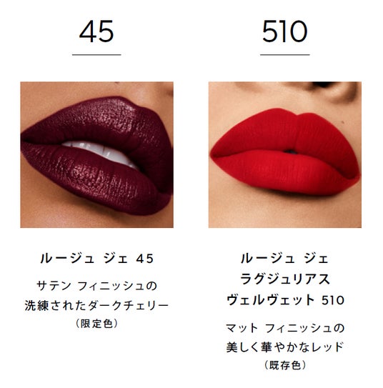 また、このコレクションにマッチする1 色を〈ルージュ ジェ ラグジュアリアス ヴェルヴェット〉の既存色から提案。この2色で、すべての人の視線を奪うツートーンリップが完成します。