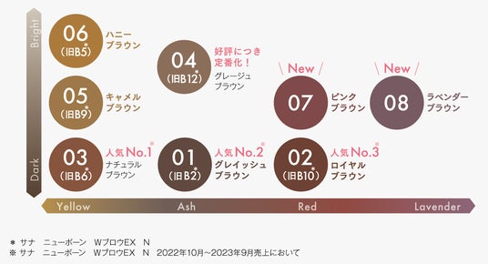 カラーラインアップはブラウンを基調とした似合う色が見つかる8色展開。人気の5色はそのままに、好評だった限定色のグレージュブラウンを定番化し、トレンドを押さえたピンクブラウン、ラベンダーブラウンを新たに追加しました。