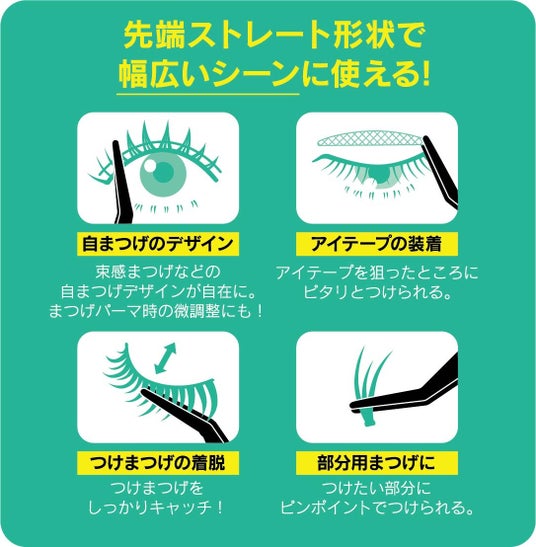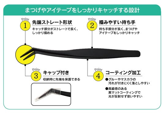 先端ストレート形状で、まつげやアイテープを掴みやすい、アイメイク用ツィザーズ。持ち手部分が長く、安定した使い心地。マットコーティングでグルーやマスカラの汚れが付きにくく落としやすい。束感のあるまつげの仕上げや、つけまつげの着脱等に便利。