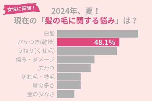 調査の結果、「白髪」に悩んでいる方が最も多く、つづいて「パサつき(乾燥)」、「うねり(くせ毛)」に悩んでいる方が多いことが分かりました。