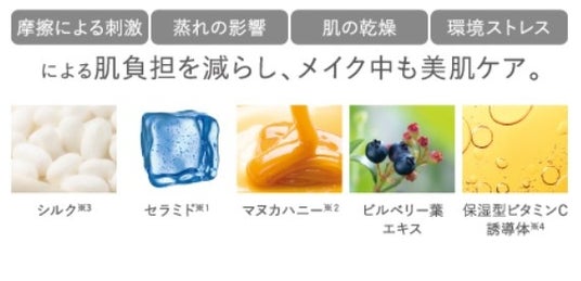 肌負担を減らし、メイク中も美肌ケアたっぷりの美容成分配合で、摩擦や蒸れなどマスクによるお悩みや、肌の乾燥、環境ストレスもケア。