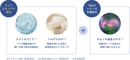 1.ナイトスキンケア処方×ネムノキ樹皮エキス*1で、乾燥肌にうるおいを与える