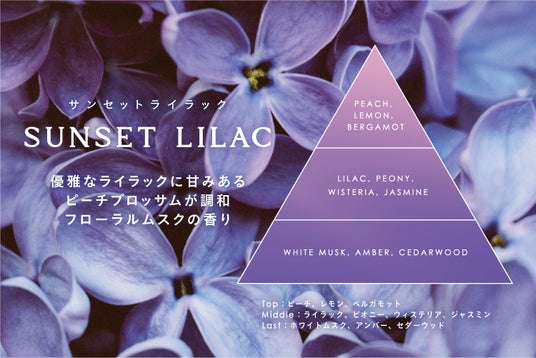 優雅なライラックに甘みのあるピーチブロッサムが調和したフローラルムスクの香り。