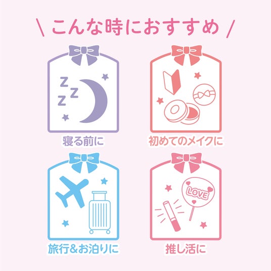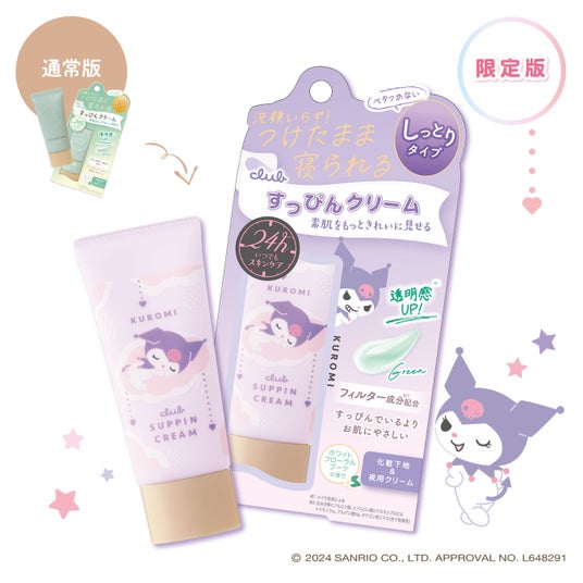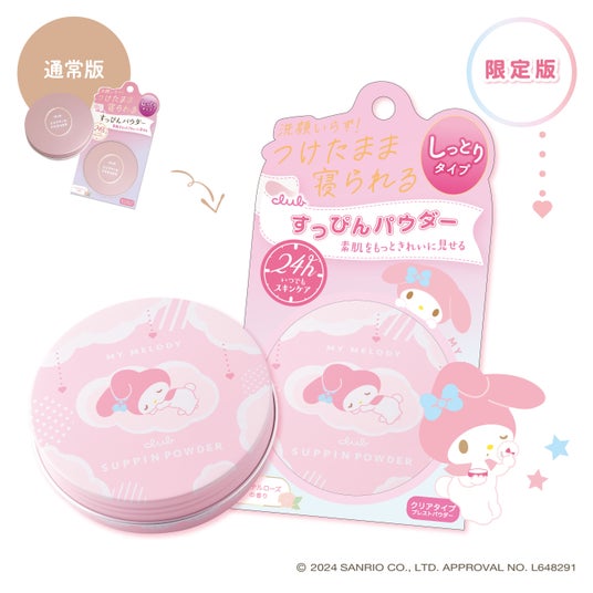 「サンリオキャラクターズ」と「クラブ すっぴんシリーズ」が融合したオリジナルデザインは、すっぴんシリーズの”つけたまま寝られる”という商品性と世界観からインスパイアされたキャラクターたちが、雲の上ですやすやと眠る『すやすやおやすみデザイン』です。おやすみ前のひとときに寄り添い心地よいナイトタイムもお楽しみください。