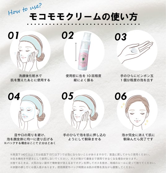 目や口の周りを避けて、顔全体に均一に塗り広げてください。数分後、手のひらで泡を押し込むように馴染ませてください。