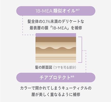 鱗状のキューティクルと、その最表面で膜を張る18-MEAは、その状態によって美しいツヤが生まれますが、カラーリングによるダメージによってめくれたり、失われたりしやすく、一度ダメージを受けると再生されることはありません。そこでキューティクル・18-MEAそれぞれに働く補修成分を配合。Wアプローチで自然なツヤを生み出します。