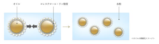 これは、SENSAIが得意とする、オイルを微細化して液中に配合させる「マイクロエマルション技術」の進化版です。リン脂質を含むオイル相と、水相を、ミックスさせ圧力をかけると同時に瞬間冷却することで超微細化粒子が誕生する、花王グループ内でも初めての技術を採用した化粧水が実現しました。