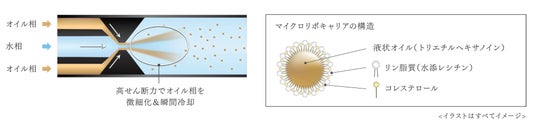 機械の中でオイル相と水相を高速で合流させ、その際少しの圧力をかけることでオイル相を微細化、ほぼ同時に冷却を行います。それにより、オイル相が超微細化油滴=「マイクロリポキャリア(保湿)*2」へと形を変え、安定的に化粧水の中に配合することを実現しました。